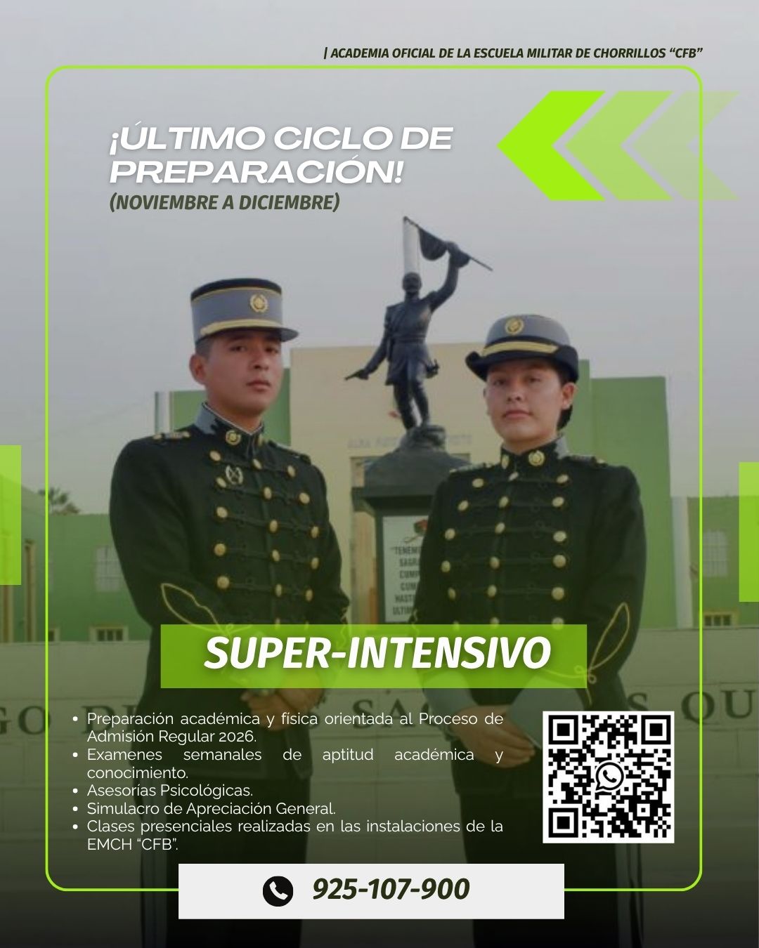 Somos la mejor opción para que puedas hacer realidad el ingreso a la Escuela Militar de Chorrillos "CFB". Nuestra preparación de alto nivel y los mejores docentes nos convierten en la mejor academia PRE MILITAR.